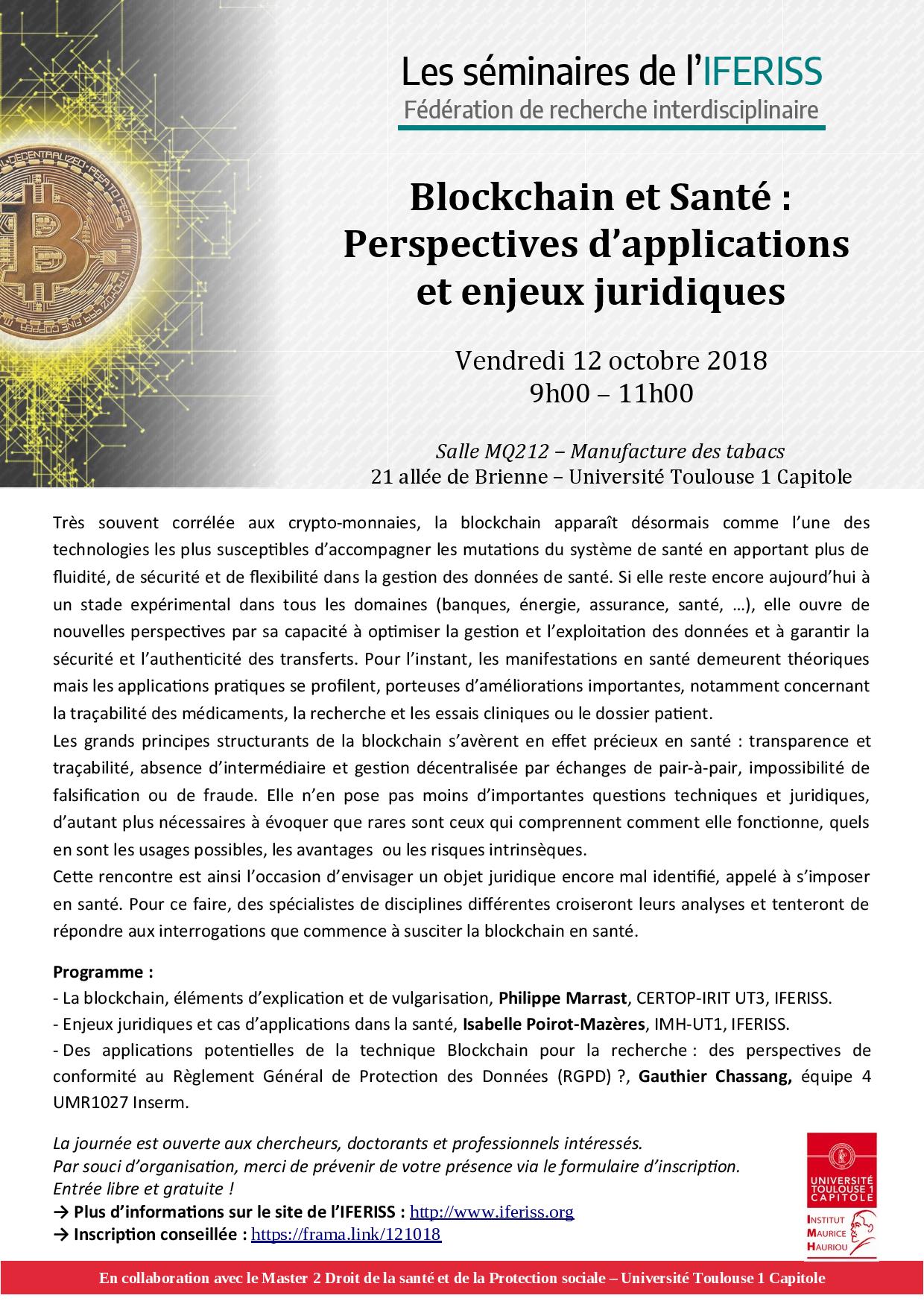"Blockchain et Santé" Perspectives d'applications et enjeux juridiques " Séminaire organiser par l'IFERISS et l'IMH