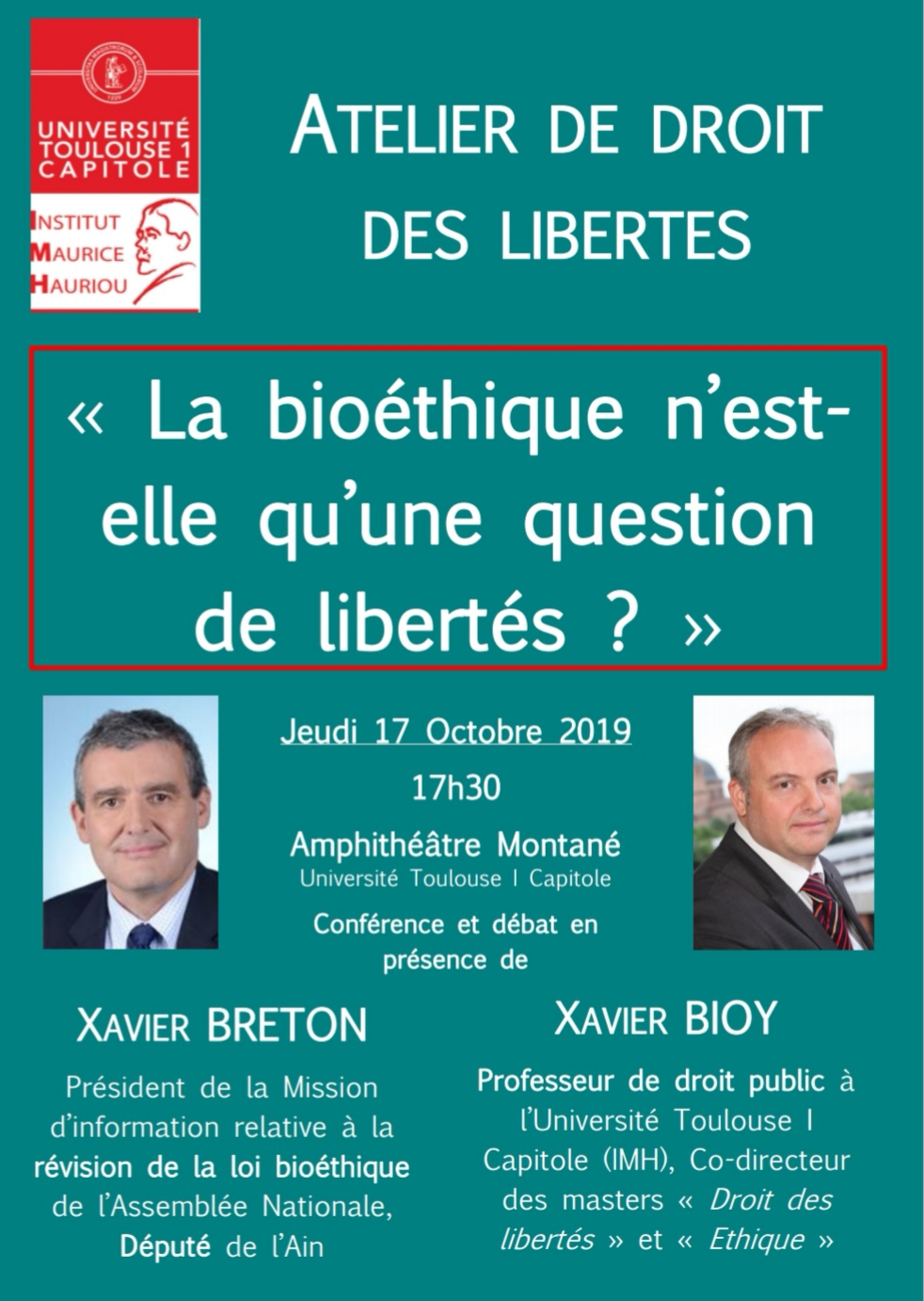 - La bioéthique n’est-elle qu’une question de libertés ?, Conférence et débat en présence de X. Breton, Président de la mission d'information de l'Assemblée Nationalerelative à la révision de la loi bioéthique, Député de l'Ain, et X. Bioy, Professeur de droit public à l'Université Toulouse Capitole (IMH), Co-directeur des masters "droit des libertés" et "Éthique", 17 octobre 2019
