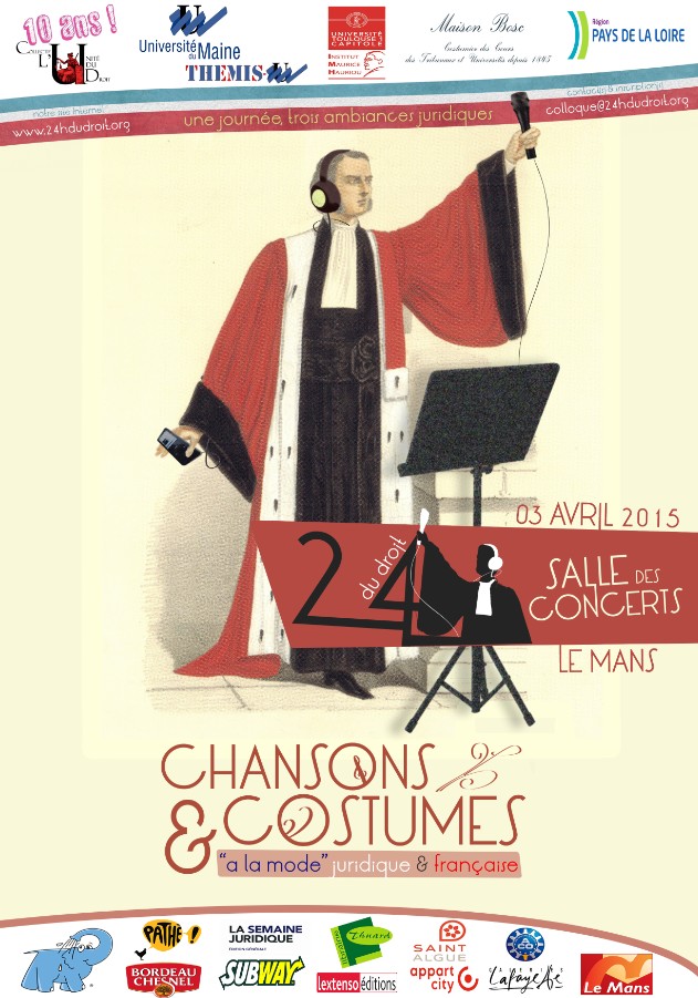 Colloque organisé dans le cadre des " 24 heures du droit ". Il s’agit d’une analyse des idées politiques et juridiques véhiculées par les chansons françaises. Il se situe dans la lignée des colloques comme " droit et littérature " ou " droit et rock ". Les contributeurs seront sélectionnés sur leur réponse à un appel à contribution déjà diffusé.