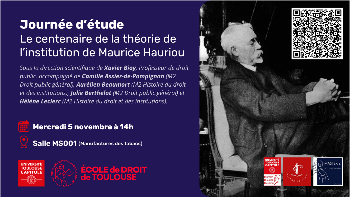 Le Master Droit public Général et le master Histoire du droit et des institutions de l'École de Droit de Toulouse, organisent une journée d’étude consacrée au centenaire de la théorie de l'institution de Maurice Hauriou, sous la direction scientifique de Xavier Bioy, Professeur de droit public à l'École de Droit de Toulouse et membre de l’EDT-R (IMH), accompagné de Camille Assier-de-Pompignan (M2 Droit public général), Aurélien Beaumort (M2 Histoire du droit et des institutions), Julie Berthelot (M2 Droit public général) et Hélène Leclerc (M2 Histoire du droit et des institutions). Découvrez le programme !