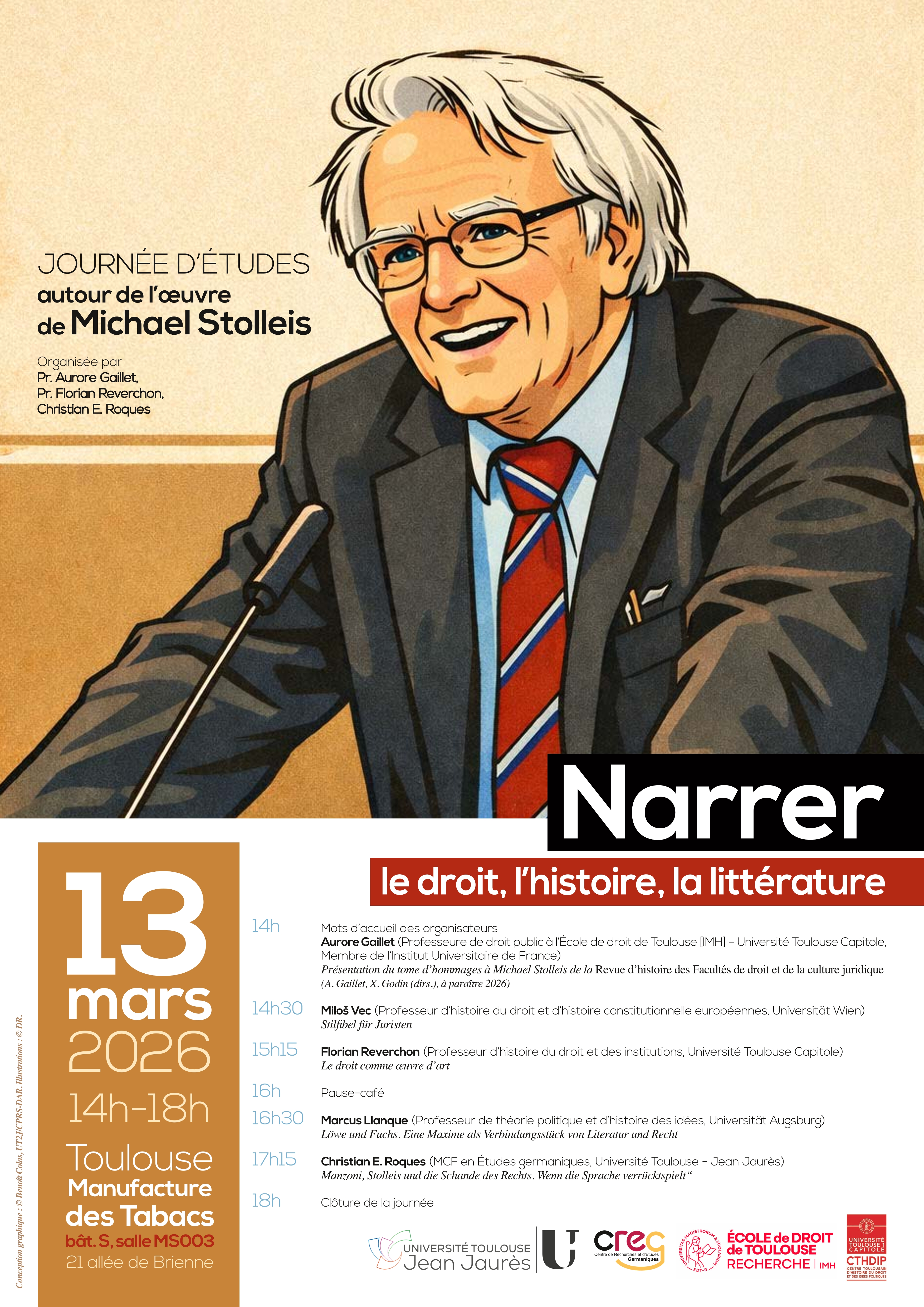 L’Institut Maurice Hauriou, le Centre de recherches et d’études germaniques de l’Université Toulouse Jean-Jaurès et le Centre toulousain d’histoire du droit et des idées politiques coorganisent une journée d’études d’intitulée « Narrer le droit, l’histoire et la littérature » en hommage au professeur Michael Stolleis (1941-2021). Celle-ci a lieu le vendredi 13 mars à partir de 14 heures à la Manufacture des Tabacs .